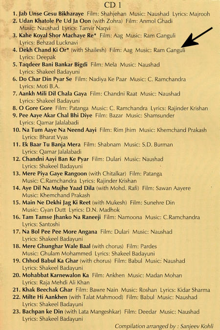 Song 4 on first CD “Dekh chand ki Or” from Aag (1948) is one good example of such goof ups. It is erroneously attributed to Shamshad Begum and Sailesh, when in fact this song is sung by Meena Kapoor and Sailesh. Just a casual hearing of this song is enough to tell you that this song is NOT sung by Shamshad Begum. But still on Youtube and many other places this song is attributed to her.